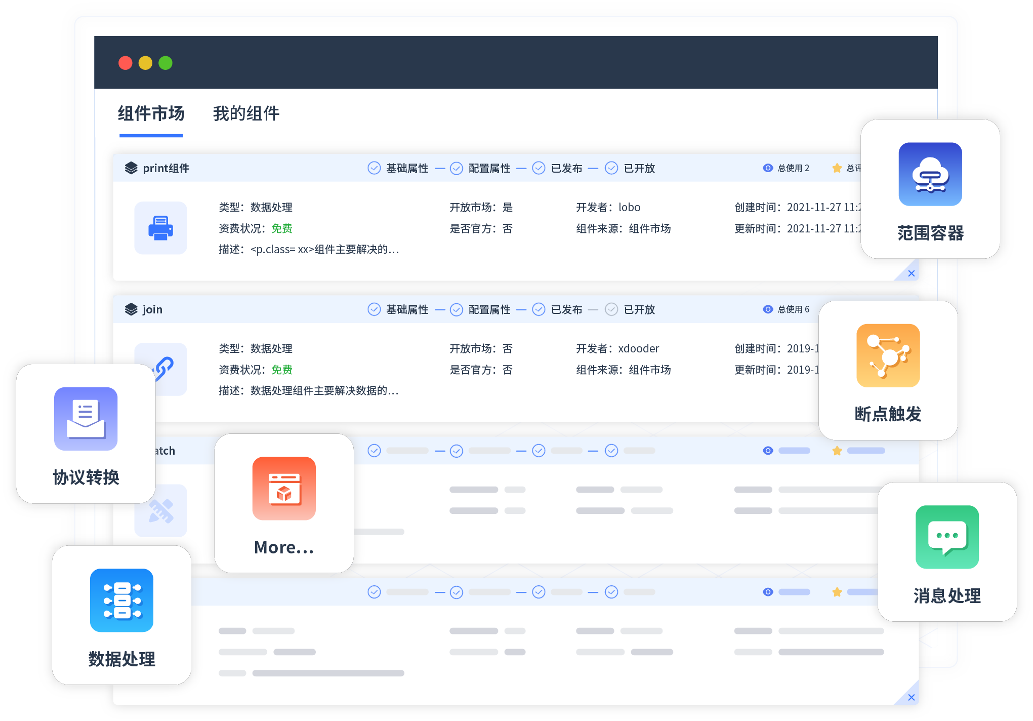 针对集成场景,君临国际提供组件市场,例如协议转换、消息处理、文件操作等。除平台提供的组件外,客户可以自定义所需组件。